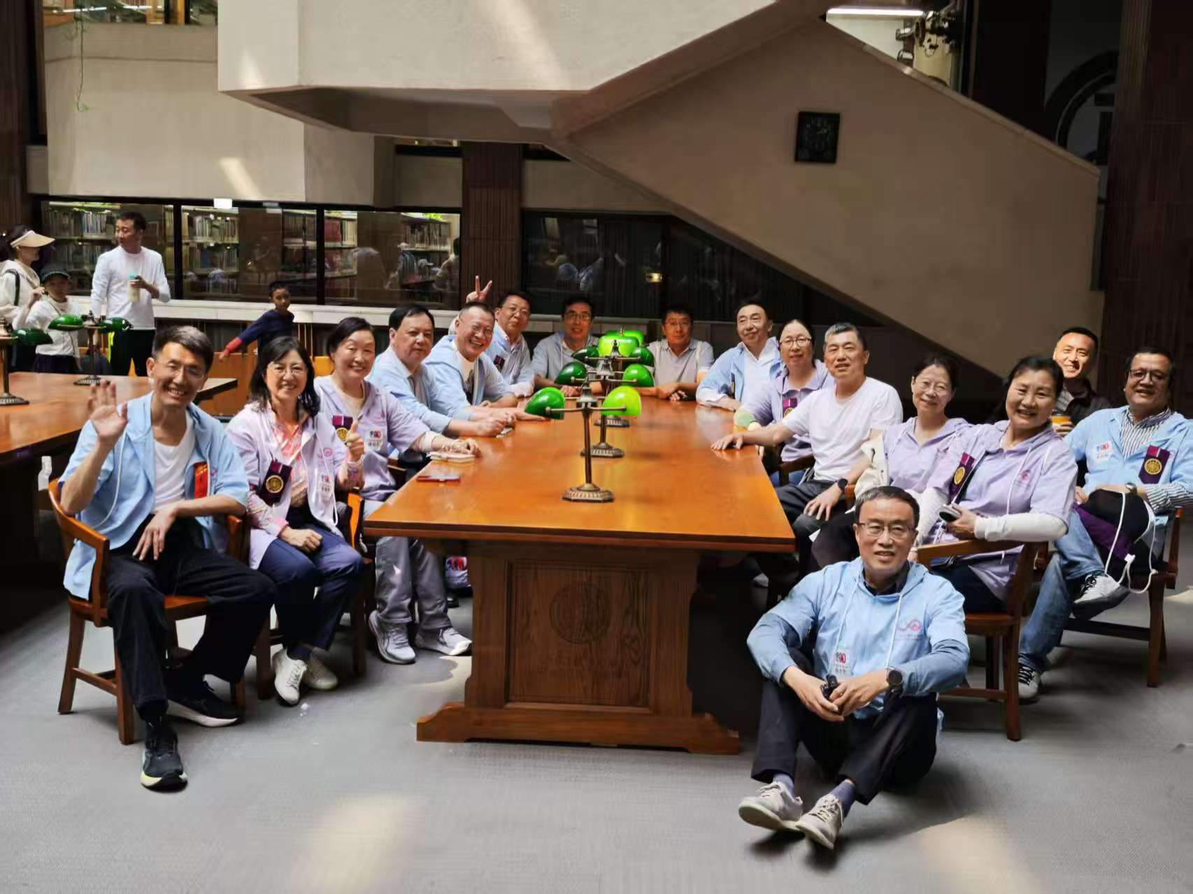 各级系友在座谈结束后,便开始慢慢捡拾起曾经那群少年安放在校园各处的时光拼图。在食堂用餐时,熟悉的饭菜香气仿佛是一把神奇的钥匙,瞬间唤起了味觉里的记忆。大家围坐在一起,聊起了母校那些令人难忘的美食。提到“烧茄子”,那浓郁的酱香和软糯的口感仿佛就在舌尖上重现;说起“烤馒头”,大家不禁笑出声来,回忆起当年还未等菜打齐,就迫不及待地三两口消灭掉这主食,最后净吃菜了。这些简单的食物,承载着青春的味道,让人回味无穷。80级校友还回到图书馆参观,找到了位于西馆大厅数0班在毕业三十年时捐赠的桌子,并留下了合影“同桌的你”。继承了“无体育不清华”的精神,系友们来到理科楼前的下沉式草地,踢起了足球。虽然岁月已经带走了当年在东大操场砂砾土操场上奔跑的勇猛、速度和拼劲,但大家依然充分享受着体育带来的乐趣和精神力量。在绿茵场上,他们奔跑、欢笑,用汗水和热情诠释着清华体育精神的传承。