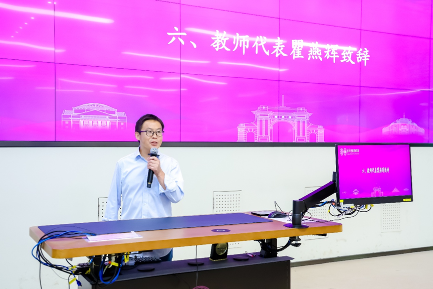 辅修学生代表计算机系滕启成同学发言。他首先代表全体辅修数学的同学,向数学系老师、助教们致以最诚挚的谢意,感谢他们为各位同学打开数学世界的大门。他表示辅修历程充满挑战和压力,但数学学习中豁然开朗的喜悦难以言表。数学辅修让他打下坚实数理基础,培养抽象思维,形成理性分析的习惯,也拓宽了他的视野,让他决定在计算机与数学交叉方向——密码学深耕,为国家信息安全作出自己的贡献。最后,他祝愿所有毕业生前程似锦,祝愿老师们身体健康、工作顺利。
