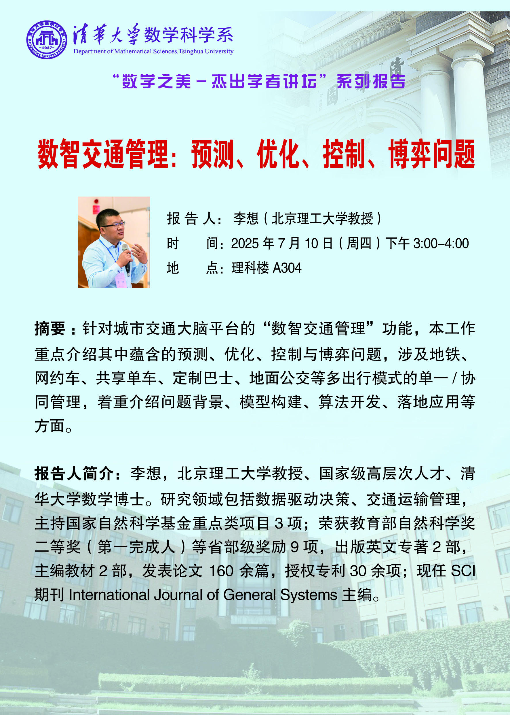 【数学之美-杰出学者讲坛】2025年第3期 || 数智交通管理:预测、优化、控制、博弈问题