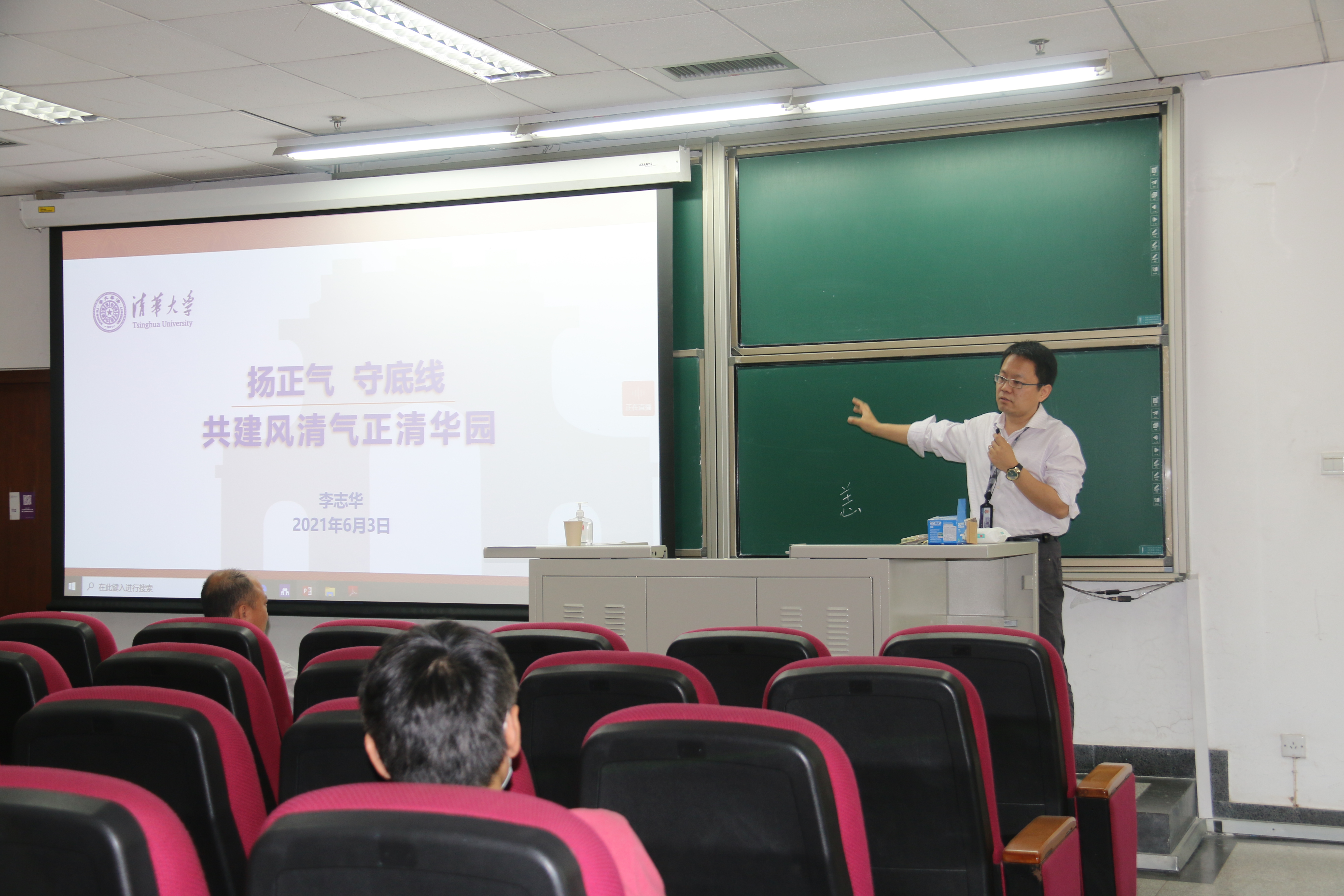 随后,李志华作题为《扬正气、守底线、共建风清气正清华园》的专题培训及警示教育。他从“清华好作风、好传统”“我校纪检工作概述”“《中国共产党纪律处分条例》和相关警示案例”三个部分进行详细讲解,突出我校“严”与“实”的纪检工作作风,详尽解读《纪律处分条例》的重点内容,进一步向党员群众普及我党的严明政治纪律和政治规矩。通过学习进一步提升数学系基层党组织人员的政治素质和履职能力,增强了党员干部的思想防线意识。