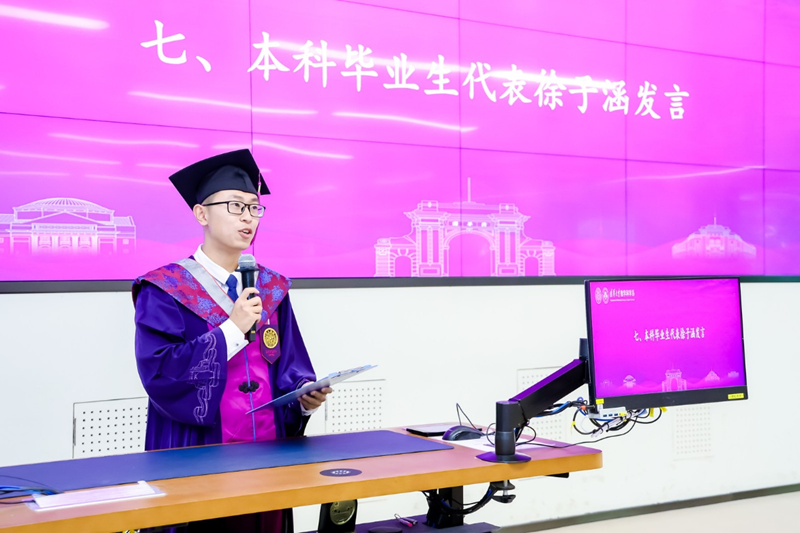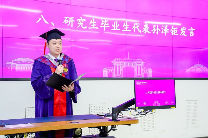 研究生毕业生代表孙泽钜同学发言。他首先感谢了老师、同窗挚友、家人们在自己求学之路上的教诲、帮助与支持。回顾在数学系的九年求学历程,他分享了两个关键词:科研要慎重“选择”兼具学术价值、国家需求的方向和兼具兴趣和挑战的课题;做学问要“坚持”向上攀登,克服困难。他认为,选择与坚持不仅贯穿于学习科研,还在于社工志愿中,要“立大志、入主流、上大舞台、干大事业”,肩负时代使命。最后他感谢数学系的栽培,祝愿老师身体健康、桃李满园,毕业生前程似锦、梦想成真。
