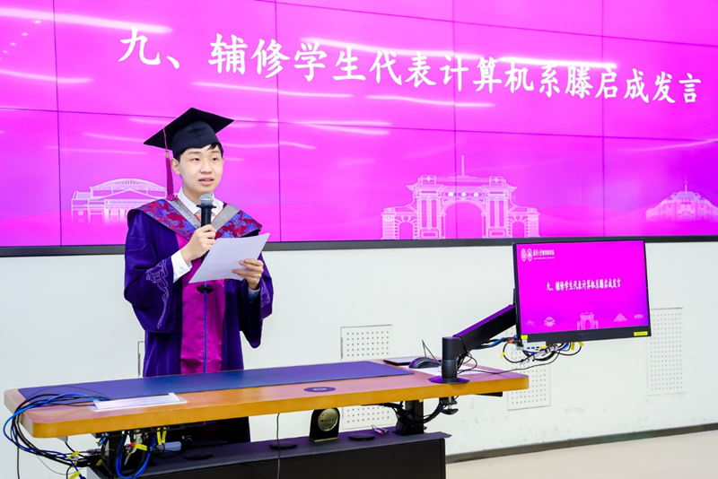 辅修学生代表计算机系滕启成同学发言。他首先代表全体辅修数学的同学,向数学系老师、助教们致以最诚挚的谢意,感谢他们为各位同学打开数学世界的大门。他表示辅修历程充满挑战和压力,但数学学习中豁然开朗的喜悦难以言表。数学辅修让他打下坚实数理基础,培养抽象思维,形成理性分析的习惯,也拓宽了他的视野,让他决定在计算机与数学交叉方向——密码学深耕,为国家信息安全作出自己的贡献。最后,他祝愿所有毕业生前程似锦,祝愿老师们身体健康、工作顺利。
