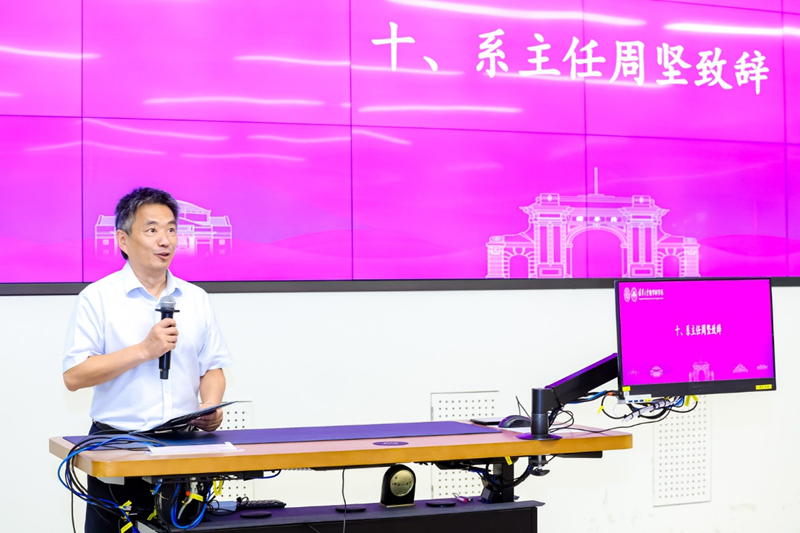 数学系系主任周坚老师作最后致辞。周坚老师指出同学们一路走来的点点滴滴,都凝聚了每一位教职员工的辛勤付出,号召毕业生们起立为这些老师们鼓掌致敬。他将老师们的工作比作育苗和移栽,让学生们在更广阔的天地成长。他引用“1万小时”定律和分享前辈老师的故事,希望毕业生们在年轻时能持续不断地努力,在自己的领域中向上攀登。最后,周坚老师寄语毕业生“争取至少为祖国健康工作五十年”,期待未来同学们在清华园重聚,归来仍是少年。