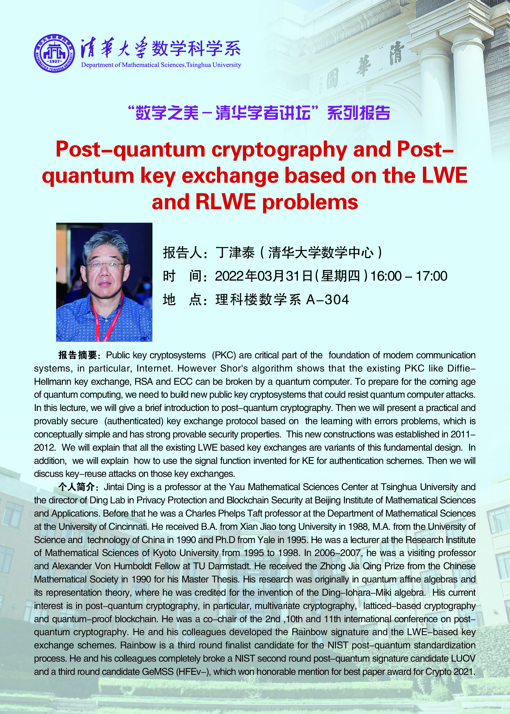 【数学之美-清华学者讲坛】Post-quantum cryptography and Post-quantum key exchange based on the LWE and RLWE problems