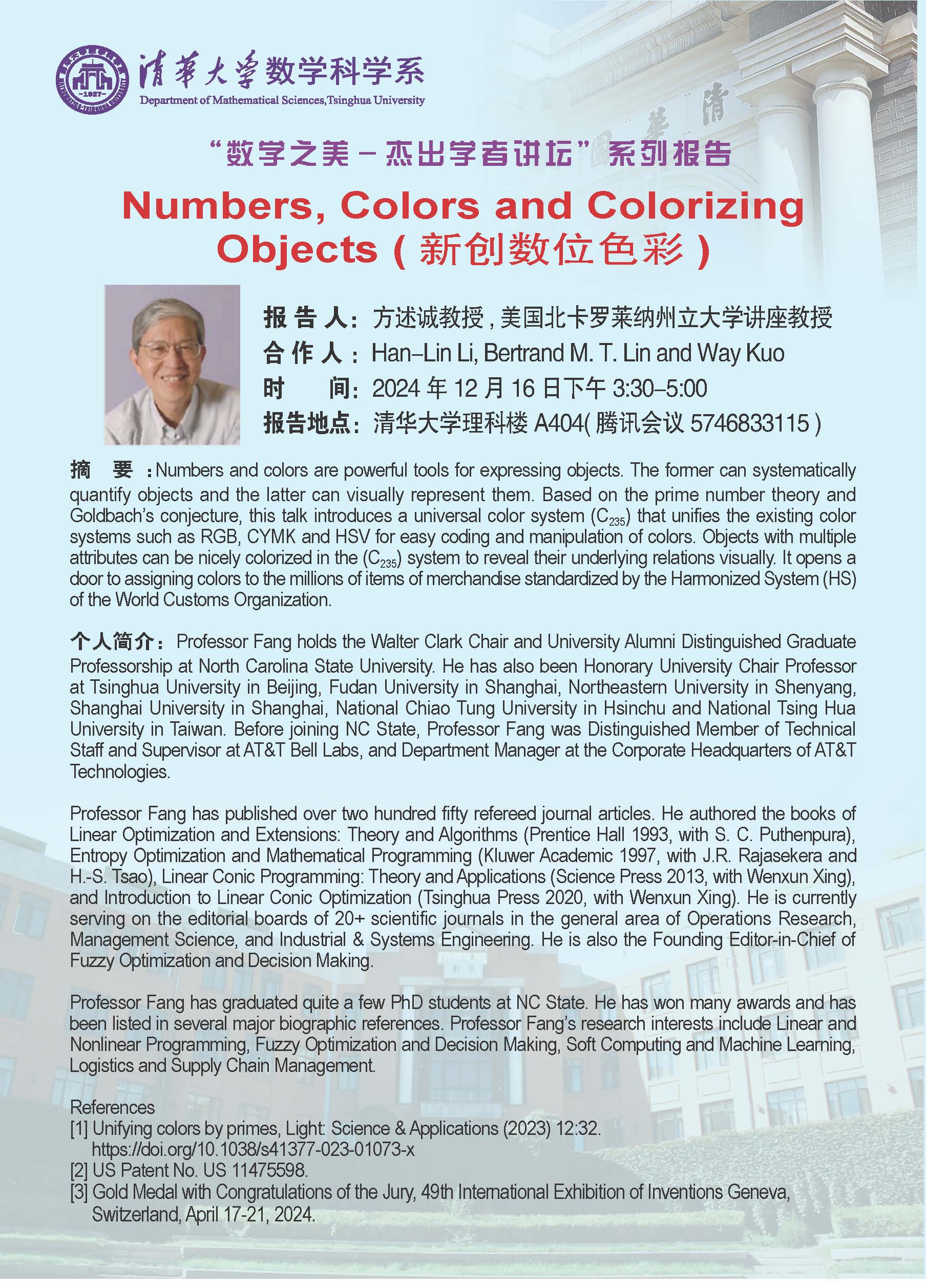 【数学之美-杰出学者讲坛】2024年第7期 || Numbers, Colors and Colorizing Objects (新创数位色彩)