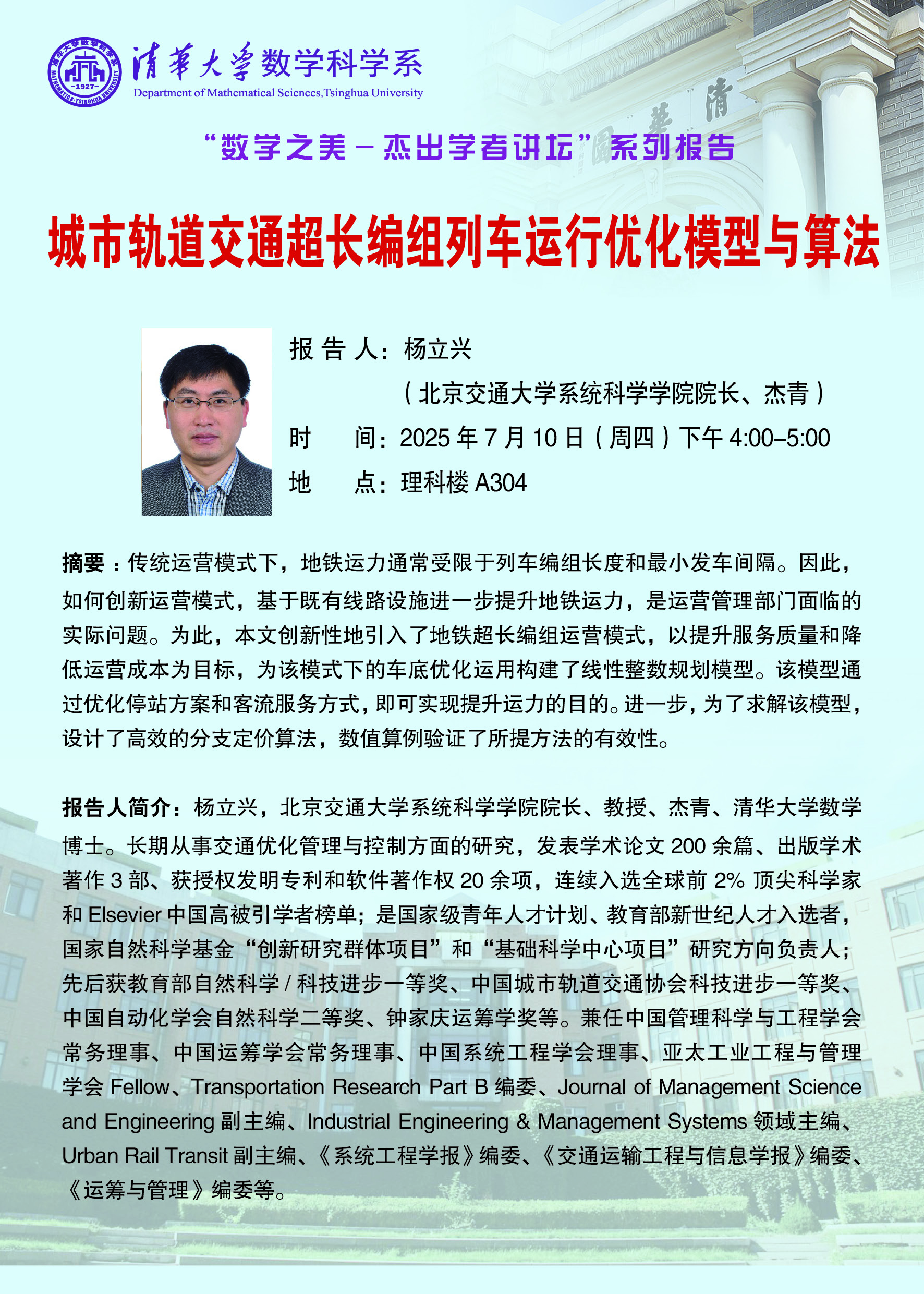 【数学之美-杰出学者讲坛】2025年第4期 || 城市轨道交通超长编组列车运行优化模型与算法