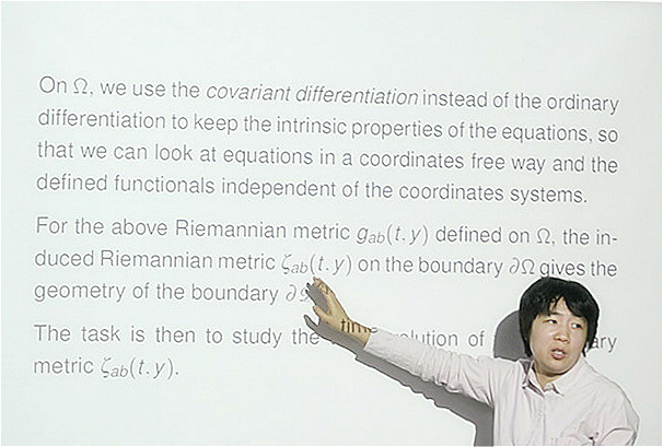 曾惠慧在这个报告中,介绍了流体自由边界问题的一些进展,并以低流速热传导无粘流的流体自由边界问题为例,说明有关问题的一些定性研究的方法。报告受到了在场师生的欢迎,大家纷纷就流体自由边界问题在偏微分方程理论和实际应用、及其与物理、工程及医学模型的联系提问并进行探讨。
