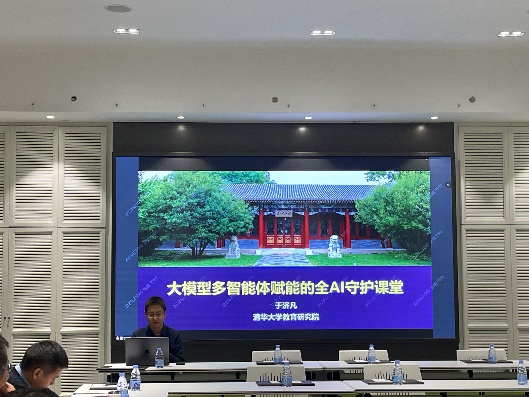 之后,会议的下半场由左怀青进行了主持。第一场报告人中国政法大学习近平法治思想研究院副院长林华教授对《中华人民共和国学位法》的立法背景、基本框架及主要内容进行了深入解读,阐释了学位法对高等教育的深远影响。第二场报告由清华大学教育研究院助理研究员于济凡主讲,报告主题为《大模型多智能体赋能的全AI守护课堂》,该报告对于AI赋能的研究项目背景及目前的主要研究项目及方向进行了详细介绍。于济凡所介绍的AI赋能全AI守护课堂的研究项目,引发了与会教师对AI技术在教学中应用的热烈讨论。